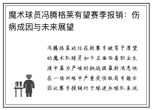 魔术球员冯腾格莱有望赛季报销:伤病成因与未来展望